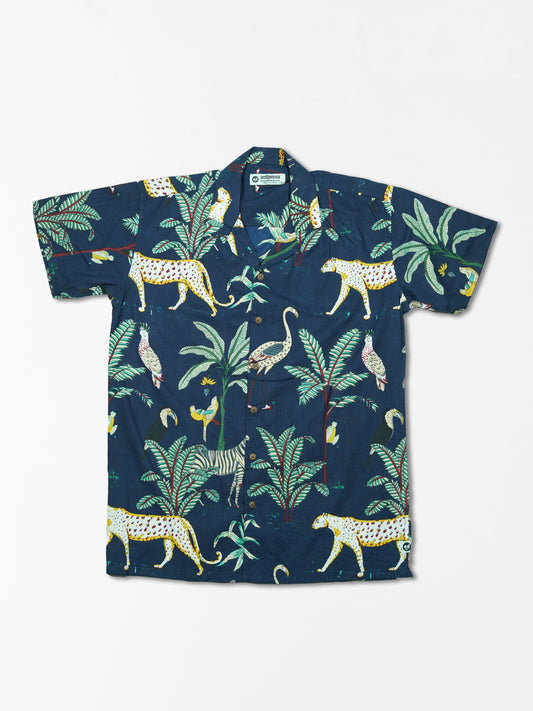 Jungle Blue - Sanganeri Print - Unisex Pure Cotton Cuban Collar Shirt